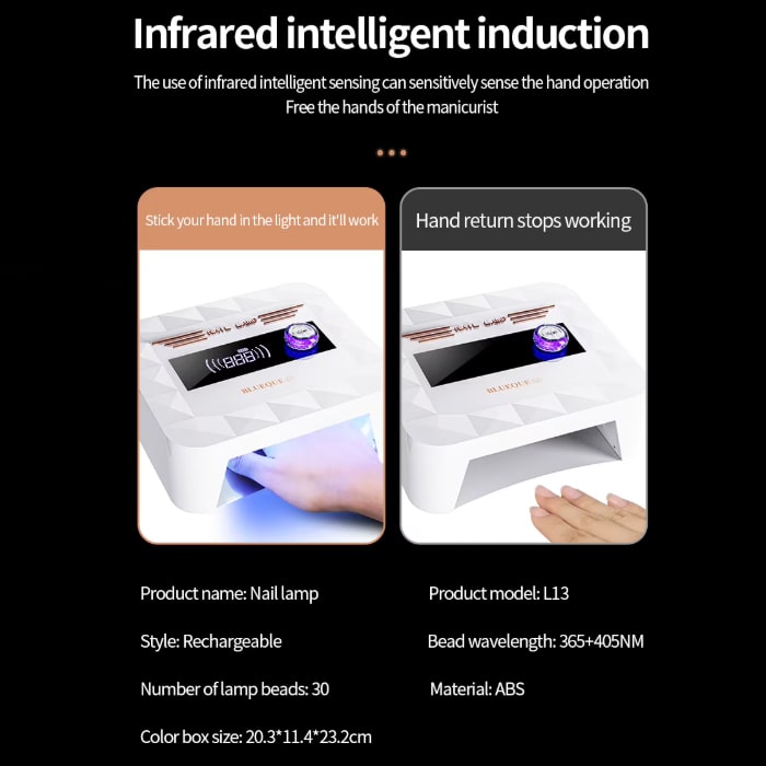 لامپ بلوکیو مدل L13 با تکنولوژی Dual Light (UV+LED) طراحی شده است و با تمامی انواع ژلهای ناخن شامل لاک ژلهای معمولی، ژلهای بیس کات، تاپ کات، ژلهای بیلدر، پلی ژلها، و انواع ژلهای کاشت ناخن سازگار است. این دستگاه میتواند هر دو نوع ژل UV و ژل LED را به سرعت و به طور کامل خشک کند.
